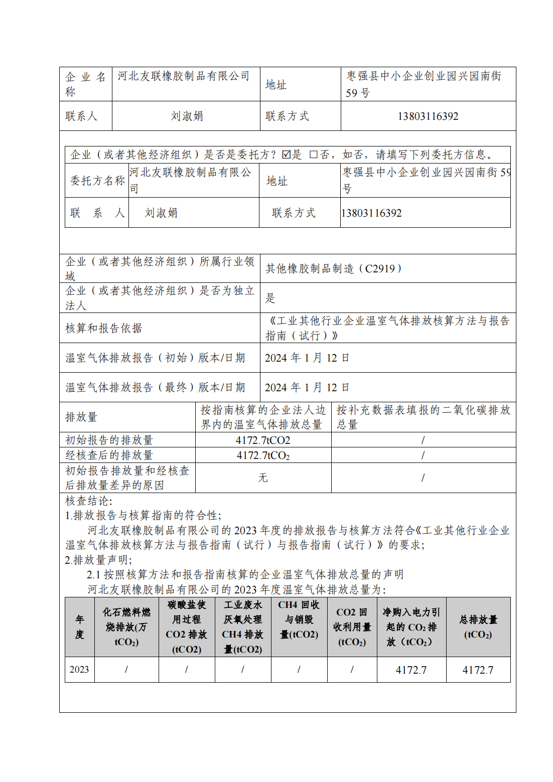 河北友聯(lián)橡膠制品有限公司2023年度溫室氣體排放核查報告